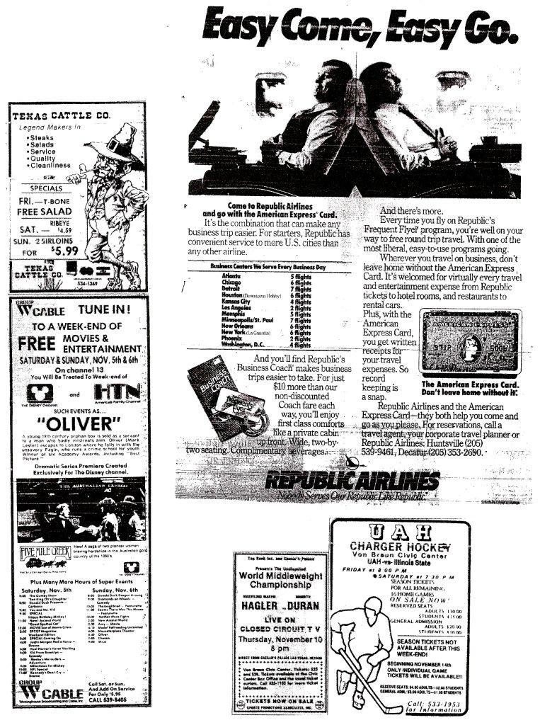 DISCLAIMER: Huntsville Rewound™ is NOT sanctioned by, nor is it produced under the auspices of any city or company. All graphics are self-produced; photos and other memorabilia found on this page originate from the private collection of the Webmaster and local citizens, and from the high generosity of other, history-loving people (credited throughout the Website/facebook site). All logos, past and present, are the property of their respective owners. They're featured for historical purposes, and the Webmaster does not challenge any ownership rights. Please also get permission before posting any item from an existing website onto the facebook site. When permission is given you will probably need to link to that site in your description. Seeing picture content on a public website such as this does NOT translate to their being in the public domain. Please do NOT post any of these photos into any local retro or historical webpage or facebook page without WRITTEN authorization of the webmaster. Please contact the webmaster with any of these concerns. Huntsville Rewound™ is a trademarked entity (since 2009) Thank You