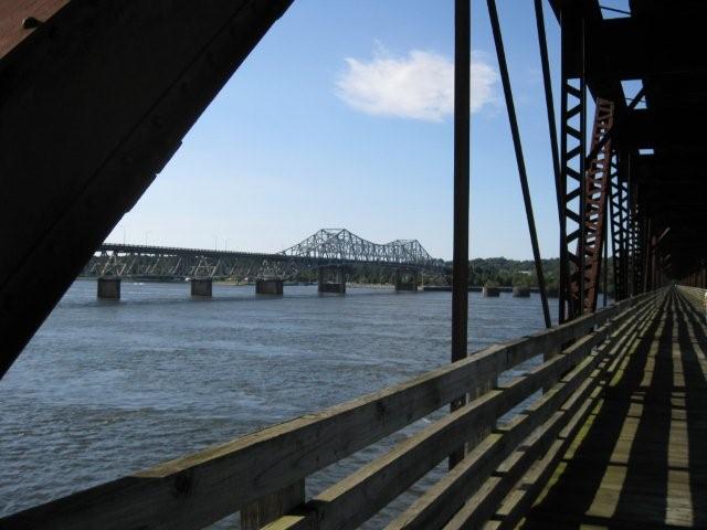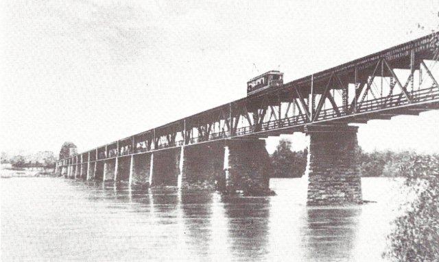 The old Tennessee River Bridge in 2009 (cart/buggy/car level) -picture with trolley is above State Line near Cherokee AL (Old Memphis Pike runs behind sign) Ivy Green (Childhood Home of Helen Keller)